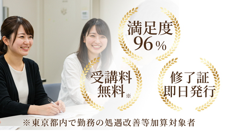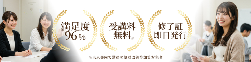 受講料・テキスト代が無料の研修は、なかなかありません!無料とは言っても、経験豊かな講師の研修と、質の高いオリジナルテキストを用いていますので、経済的な負担を気にせず実践的な知識を習得できます。