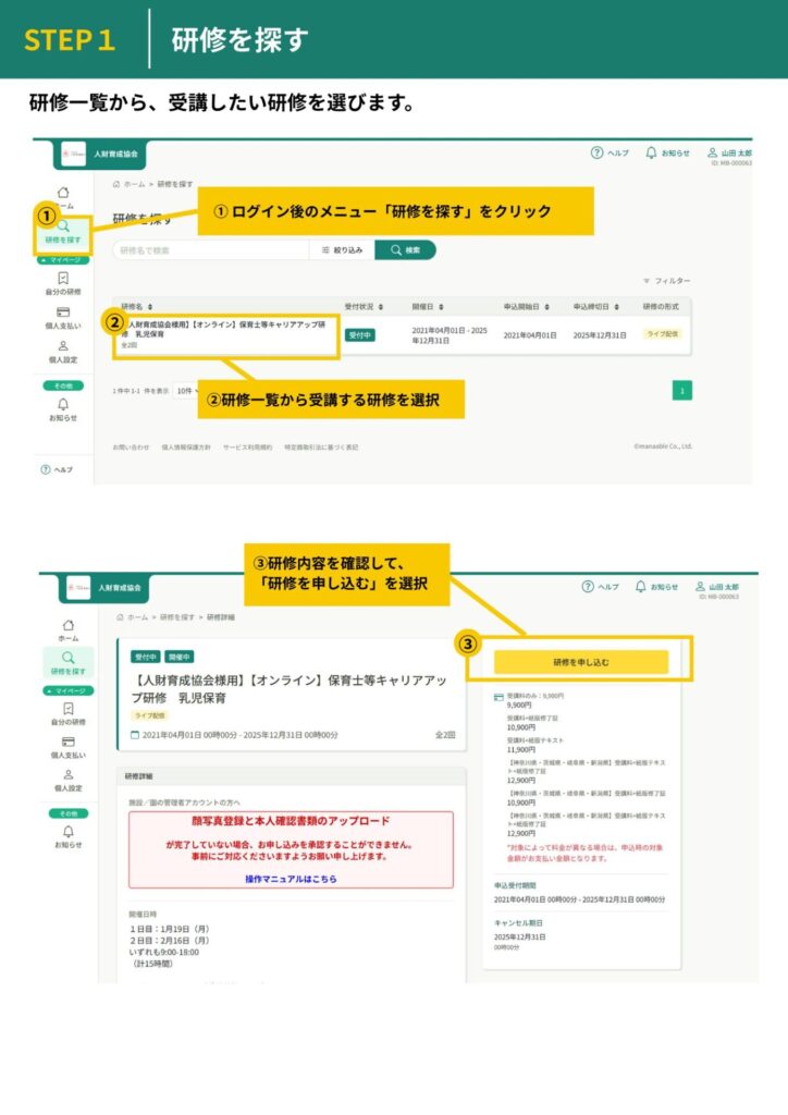 本マニュアルでは、マナブルを使って研修を申し込む方法を順を追ってご案内します。